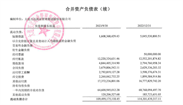 截至相同报告期,万达商管非流动负债有1938.61亿元,主要为长期借款,其长期有息负债合计有1245.61亿元。此外,万达商管还有流动负债1094.99亿元,主要为一年内到期非流动负债,其一年内到期的非流动负债为646亿元。从流动性上来看,万达商管账上货币资金有132.69亿元,较2022年末进一步下降,无法覆盖短期债务,现金短债比为0.2,公司存在较大短期偿债压力。