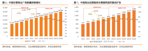 从行业来说,商业物业市场规模持续增长,在管广场数量和在管面积稳定扩张。根据弗若斯特沙利文统计,中国在管商业广场总数由 2016 年的 15,167 家增加至 2021 年的 22,646 家,CAGR为 8.3%,预期到 2026 年进一步增长至 30,068 家,2021-2026 年 CAGR 为 5.8%。中国在管零售商业物业总建筑面积由 2016 年的近 6 亿平方米增长至 2021 年的 9 亿平方米,CAGR为 8.5%,预期于 2026 年将达到 12.5 亿平方米,CAGR 为 7.0%。