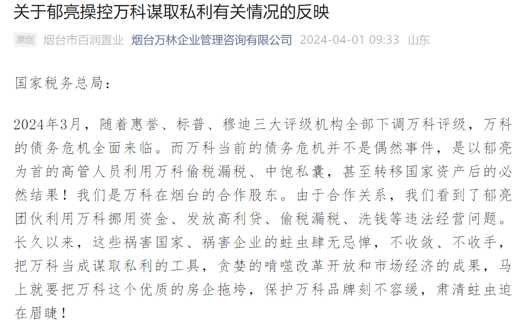 4月1日,烟台市百润置业发布《关于郁亮操控万科谋取私利有关情况的反映》在社交媒体流传,文中称,“郁亮团伙利用万科挪用资金、发放高利贷、偷税漏税、洗钱等违法经营问题”,还列举了大量事例和细节。