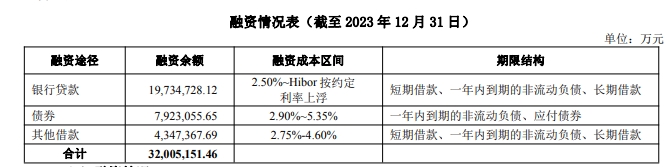 年报披露,2023年末,万科净负债率54.7%,较2022年底提高11个百分点。期末,有息负债合计约3200.5亿元,一年内到期的有息负债约624.2亿元,一年以上有息负债约2576.3亿元。在其借款中,银行借款占61.7%,约1973亿元,应付债券约792亿元,其他借款约435亿元。