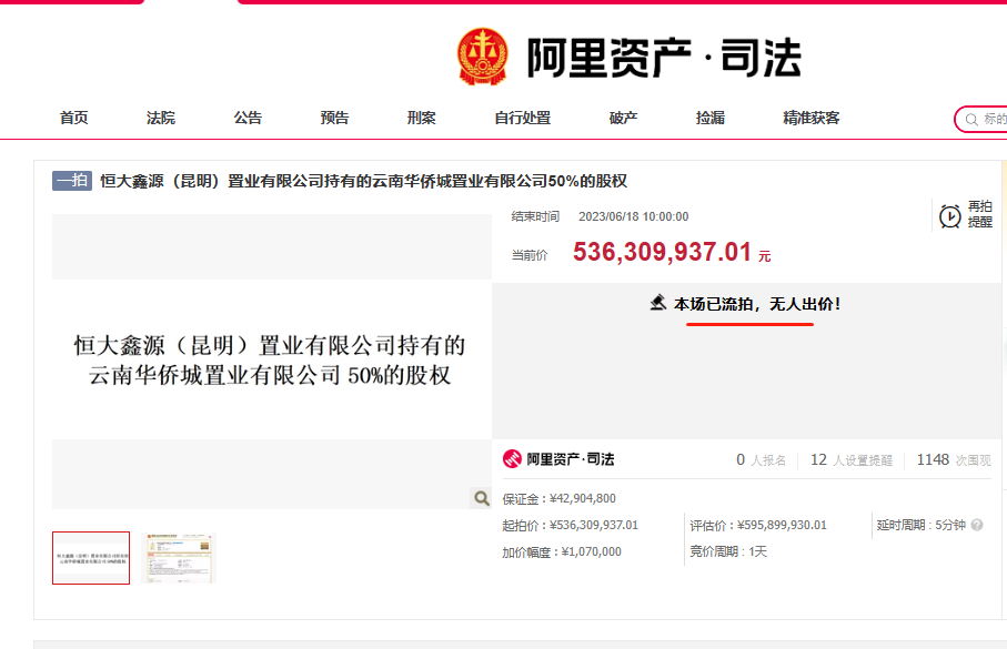 6月19日,阿里法拍显示,恒大鑫源(昆明)置业持有的云南华侨城置业50%的股权一拍因为无一人报名,最终流拍,该标的物起拍价5.36亿元。