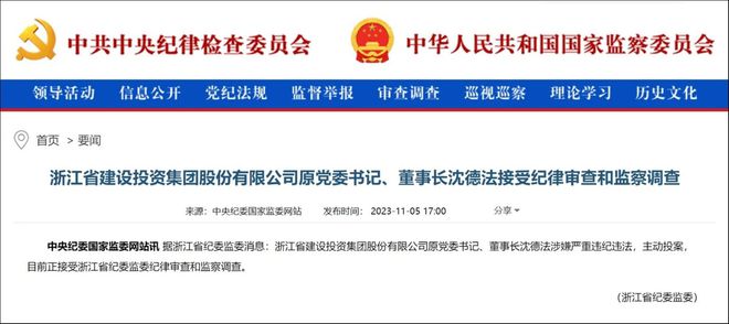 2023年11月5日,据浙江省纪委监委消息,浙江建投时任董事长沈德法涉嫌严重违法违纪,主动投案,正接受浙江省纪委监委纪律审查和监察调查。