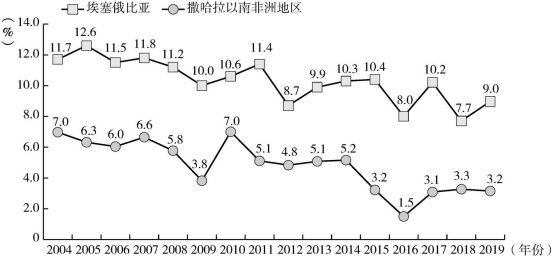 图2 2004—2019年埃塞俄比亚和撒哈拉以南非洲地区的实际GDP增长率