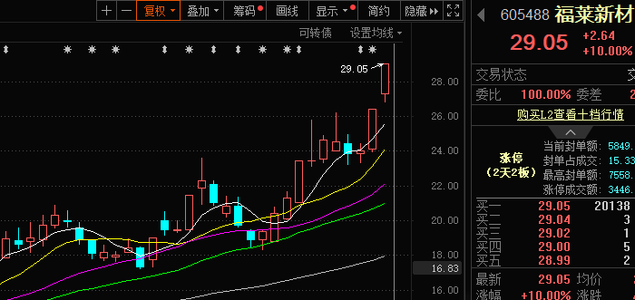 此外,福莱新材在资本市场的表现也相当抢眼。2024年9月下旬,福莱新材的股价企稳后开始反弹,随后一路震荡向上,阶段累计涨幅达到171.50%。近两个交易日,福莱新材连续涨停。截至发稿,福莱新材涨10%,报29.05元/股。