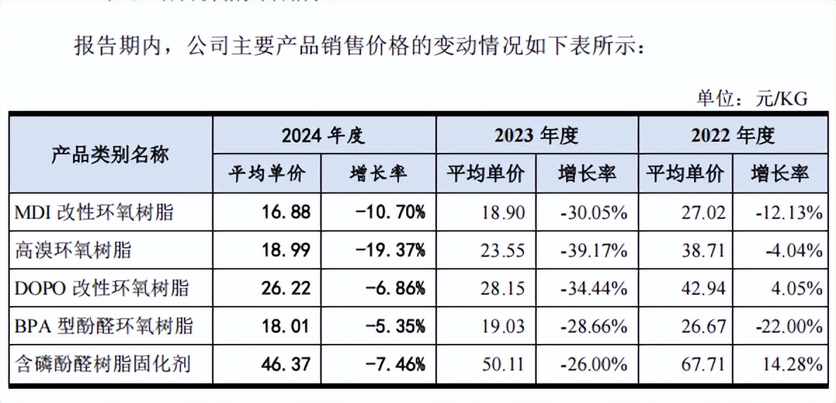 2023年及2024年,同宇新材MDI改性环氧树脂的平均单价分别同比下滑了30.05%、10.70%;高溴环氧树脂的平均单价分别同比下滑了39.17%、19.37;DOPO改性环氧树脂的平均单价分别同比下滑了34.44%、6.86%;BPA型酚醛环氧树脂的平均单价分别同比下滑了28.66%、5.35%;含磷酚醛树脂固化的平均单价分别同比下滑了26%、7.46%。