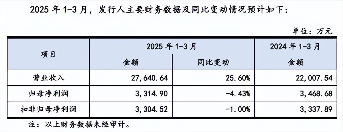 受产品销量和产品销售价格的综合影响,同宇新材预计,2025年第一季度实现营业收入为27,640.64万元,同比增长25.60%;归属于母公司所有者的净利润预计为3,314.90万元,同比下降4.43%;扣除非经常性损益后归属于母公司所有者的净利润预计为3,304.52万元,同比下降1.00%。