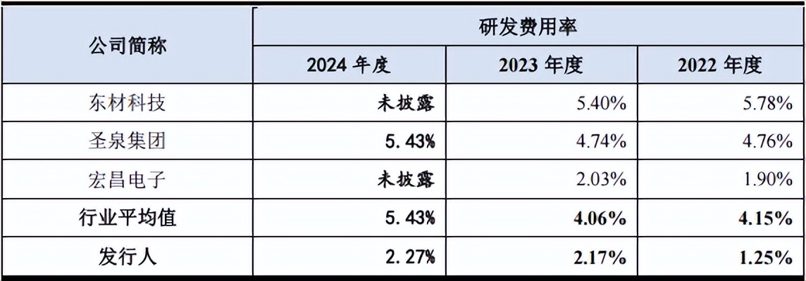 2022年度、2023年度和2024年度,同宇新材研发费用分别为1493.12万元、1925.15万元、2160.27万元,研发费用占营业收入比例分别为1.25%、2.17%、2.27%。同期,同行业可比公司研发费用率平均值分别为4.15%、4.06%、5.43%,明显低于公司同期研发费用率。