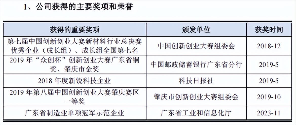 从披露的奖项看,同宇新材曾获得广东省制造业单项冠军示范企业、2019年第八届中国创新创业大赛肇庆赛区一等奖、2019年“众创杯”创新创业大赛广东省铜奖、第七届中国创新创业大赛新材料行业总决赛成长组全国第七名等。2024年并无新奖项获得。
