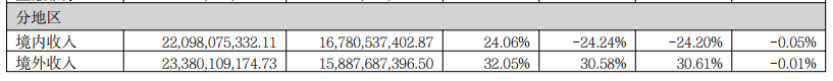 2024年,中联重科境外收入占比由2023年的38.04%提升至51.41%,也是境外营收首次超过境内。具体而言,境外收入同比增长30.58%至233.8亿元,境内收入则同比下滑24.24%至220.98亿元。同时,境外市场的毛利率比境内市场高近8个百分点。