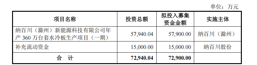 从纳百川募资用途来看,其投资建设的“纳百川(滁州)新能源科技有限公司年产360万台套水冷板生产项目(一期)”几乎全部使用募集资金,剩余资金则全部用于补流。