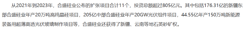 据世纪新能源网报道,从2021年到2023年,合盛硅业合计公布了11个扩张项目,总投资额超过805亿元。其中包括176.31亿元的新疆东部合盛硅业年产20万吨高纯晶硅项目,205亿元中部合盛硅业年产20GW光伏组件项目,44.55亿元年产150万吨新能源装备用超薄高透光伏玻璃制作项目等。截至今年上半年末,合盛硅业在建工程规模达352.83亿元,占非流动资产的比重超四成。