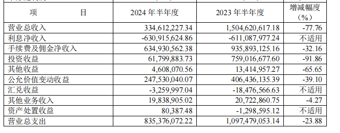 近日,天风证券公布了2024年半年度业绩报告,公告显示,公司半年度营业收入7.22亿元,同比减少66.56%,归属上市公司股东的净利润-3.24亿元,同比减少158.71%。