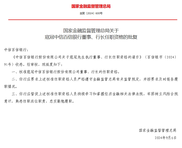 近日,国家金融监督管理总局发布关于寇冠中信百信银行董事、行长任职资格的批复,核准寇冠中信百信银行股份有限公司董事、行长的任职资格。