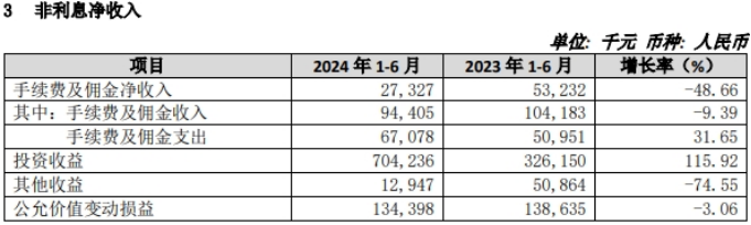 与此同时,苏农银行上半年实现非利息净收入8.43亿元,同比增长51.97%,半年报显示,非利息净收入发生重大变化的原因为投资收益增加。