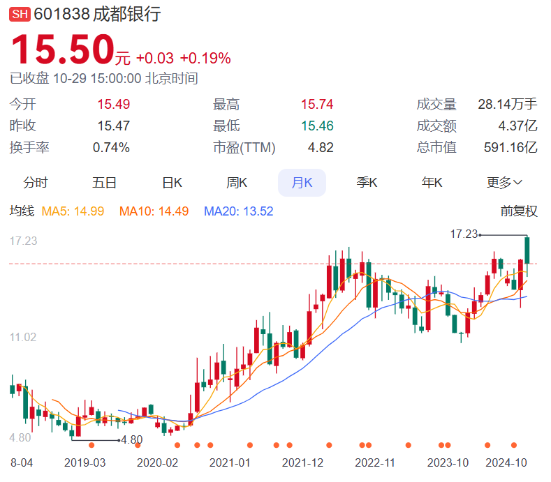 在中国城商队列中,成都银行目前整体处于上升趋势。
