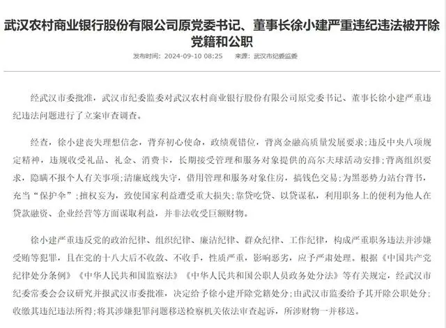 在今年9月消息,武汉农商银行原党委书记、董事长徐小建严重违纪违法被“双开”,据武汉市纪委监委消息,经武汉市委批准,武汉市纪委监委对武汉农村商业银行股份有限公司原党委书记、董事长徐小建严重违纪违法问题进行了立案审查调查。