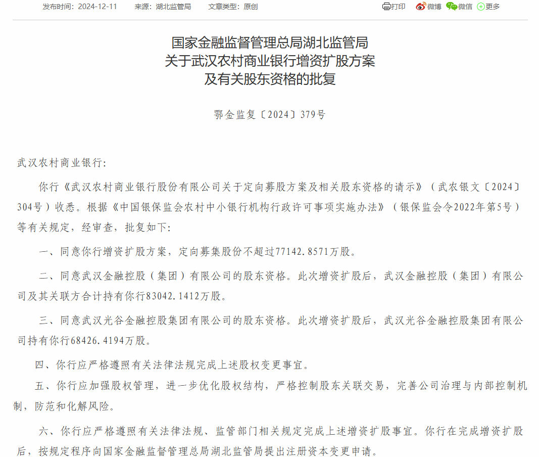 近日,国家金融监督管理总局湖北监管局披露批复显示,国家金融监督管理总局湖北监管局同意武汉农村商业银行增资扩股方案,定向募集股份不超过77142.8571万股;同意武汉金融控股(集团)有限公司的股东资格。