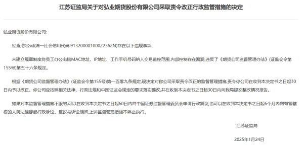1月27日,江苏证监局发布的《关于对弘业期货股份有限公司采取责令改正行政监管措施的决定》,将弘业期货内部控制的漏洞公之于众。