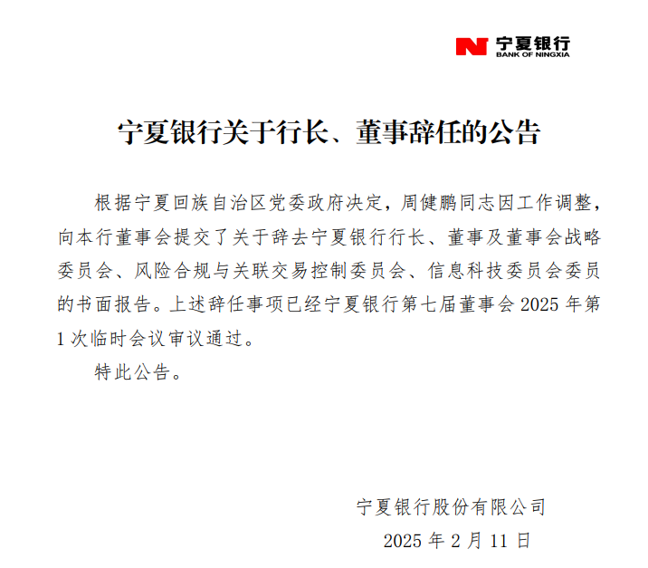 近日,宁夏银行发布关于行长、董事辞任的公告。公告显示,根据宁夏回族自治区党委政府决定,周健鹏因工作调整,向宁夏银行董事会提交了关于辞去宁夏银行行长、董事及董事会战略委员会、风险合规与关联交易控制委员会、信息科技委员会委员的书面报告。