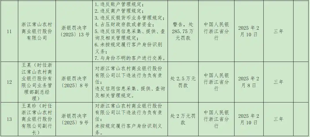 2月17日,中国人民银行浙江省分行披露的行政处罚信息显示,浙江常山农村商业银行股份有限公司因多项违法行为,被罚285.75万元。