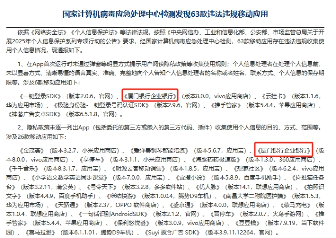 证券之星注意到,5月末,国家计算机病毒应急处理中心通报了63款存在违法收集使用个人情况的移动应用。其中,遭到通报的银行业相关应用有且只有一款,便是厦门银行旗下的“厦门银行企业银行”APP。