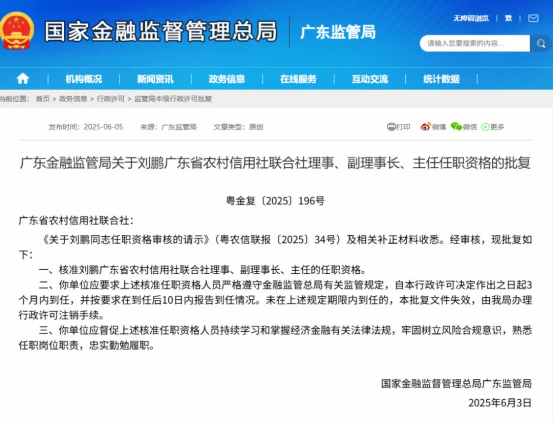 近日,广东金融监管局发布的一则行政批复显示,核准刘鹏广东省农村信用社联合社理事、副理事长、主任的任职资格。