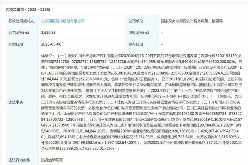 经调查,上述发票已被证实为虚开。对此,税务部门对长安信托作出了严厉处罚。不仅要求其补缴增值税190,784.80元、城市维护建设税13,354.93 元,还因其取得的发票不得在企业所得税前扣除,需补缴2020年企业所得税499,358.16元、2021年企业所得税156,889.25元。