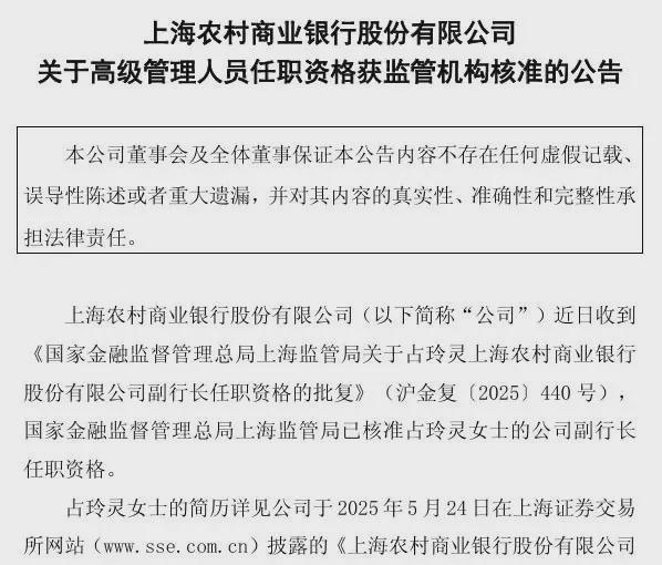 7月23日,国家金融监督管理总局上海监管局核准了占玲灵的上海农商行副行长任职资格,这意味着她正式踏入了上海农商行的核心管理层。5月24日,上海农商银行董事会提名占玲灵及张跃红任该行副行长,如今,占玲灵率先获得监管批复,她的上任之路备受期待。