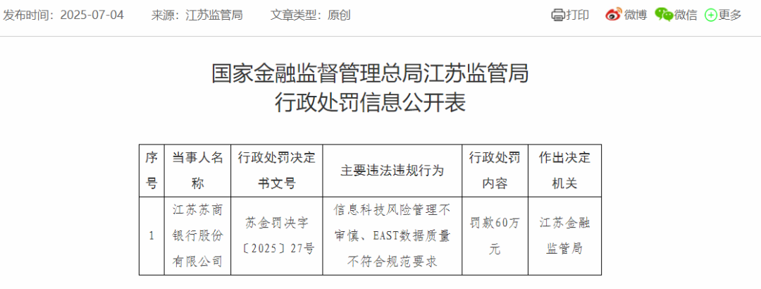 最近的一次,7月4日,国家金融监督管理总局江苏监管局披露罚单显示,苏商银行因信息科技风险管理不审慎、EAST数据质量不符合规范要求两项违法违规行为,被罚款60万元。