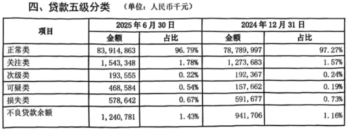 值得一提的是,深入对比贷款五级分类数据变化情况,烟台银行的风险迁徙信号也值得警惕。2025年6月末,可疑类贷款金额从2024年末的1.58亿元飙升4.69亿元,占比从0.19%升至0.54% ;关注类贷款占比微升,正常类贷款占比回落。贷款从正常、关注类向不良迁徙加速,反映银行风险识别与预警机制失效。