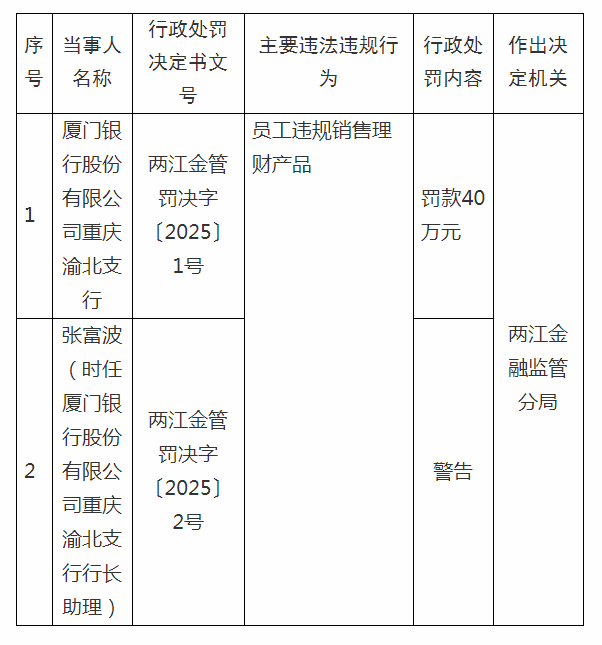 经营合规层面,上半年,国家金融监督管理总局两江监管分局行政处罚信息显示,因员工违规销售理财产品,厦门银行重庆渝北支行被罚款40万元,时任行长助理张富波被警告。