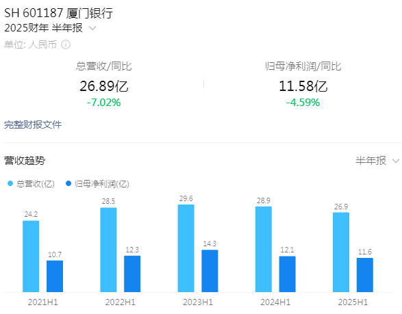 近日,厦门银行发布2025年半年度业绩报告。上半年厦门银行实现营业收入26.89亿元,同比下降7.02%;归母净利润11.58亿元,同比下降4.59%。