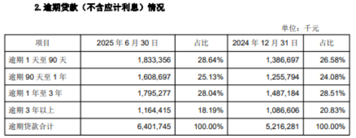 逾期1天至90天的贷款从2024年末的13.87亿元上升至 18.33亿元;逾期90天至1年的贷款从12.56亿元增至16.09亿元;逾期1年至3年的贷款从14.87亿元增长到17.95亿元。