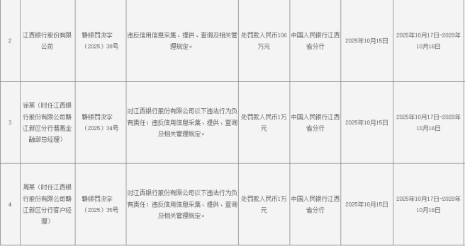 10月17日,中国人民银行江西省分行公布一则行政处罚公告显示,江西银行因违反信用信息采集、提供、查询及相关管理规定,被处以106万元罚款,两名相关责任人也各被罚1万元。同一日,江西银行苏州分行因违反账户管理规定、信用信息管理规定等五项违规行为,被警告并罚款67.2万元。