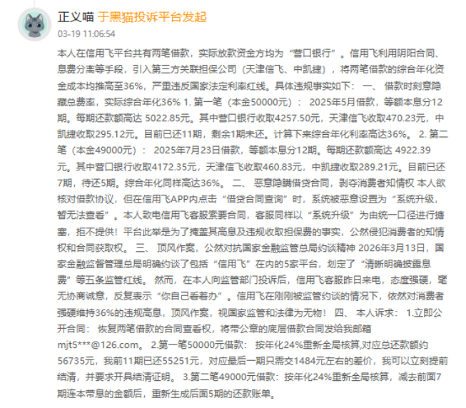 此外,有消费者反映称,于2026年2月在信用飞贷款平台申请了一笔五万元的贷款。此平台除了利息之外每月收取295元的担保费。分期12期还款每期还款5022.85元,核算下来年化利率47%,远远超过国家标准。与客服沟通开票也说没有,合理怀疑偷税漏税问题,贷款合同也查不到,也不能开具结清证明。目前该投诉于3月20日补充材料后,仍处在处理进程中。