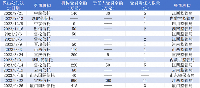 除雪松信托外,厦门国际信托(415万元)、中航信托(机构140万元,个人30万元)、重庆信托(机构200万元,个人5万元)和山西信托(110万元)四家均领到百万级罚单。