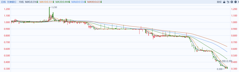 近期,甘肃银行港股股价再次猛烈下跌,自今年9月份以来跌幅超60%,年内跌幅超70%以上。截至2023年11月21日收盘0.300港元/股,甘肃银行在“仙股”之列越陷越深。