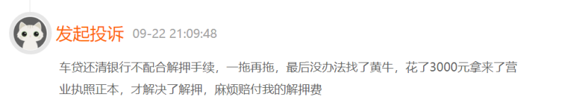 美利车金融以全员解散谢幕的背后,留给用户买车“一时爽”,还款“火葬场”的尴尬局面。时至今日,这起暴雷的余波仍未完全消除,今年9月份,在黑猫平台上有用户投诉称“微众银行伙同美利车金融进行高利息欺骗,车贷还清银行不配合解押手续,一拖再拖,最后没办法找了黄牛,花了3000元拿来了营业执照正本,才解决了解押”。