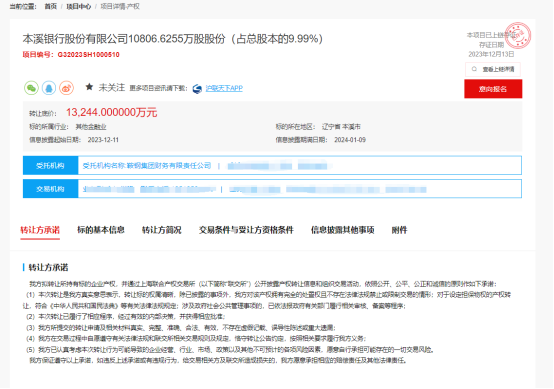 上海联合产权交易所网站信息显示,本溪银行股份有限公司10806.6255万股股份(占总股本的9.99%)近期正在挂牌转让,转让方是本钢集团有限公司,信息披露时间从2023年12月11日到2024年1月9日。