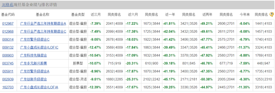 如果把时间拉长至2年,刘格菘的业绩更难看,9只在管基金跌幅均接近50%。其中广发创新升级混合基金亏损幅度达到了50.75%;亏损最小的是广发小盘成长混合A,其收益率-44.64%。