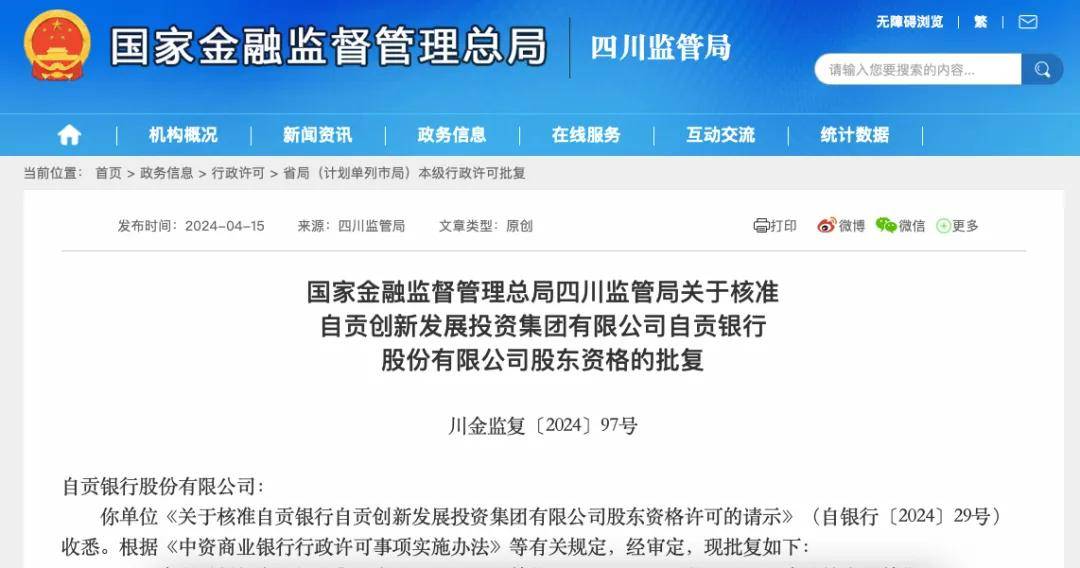 四日后,国家金融监督管理总局四川监管局发布消息,自贡创新发展投资集团有限公司已获批准受让自贡银行股份有限公司40,583.789万股股份,受让后合计持有自贡银行162,912.7494万股股份,占自贡银行总股本的75.359%,成为第一大股东。