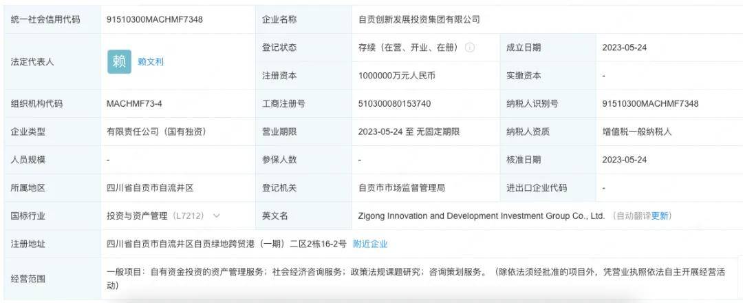 自贡创新发展投资集团于去年5月注册成立,注册资本100亿元,股东为持股100%的自贡市财政局。
