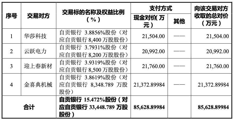 具体来看,接盘方是自贡市凤之华莎科技有限公司、自贡金喜典机械制造有限公司、自贡市迎上春新材料有限公司、自贡市云跃电力设备有限公司,四家公司分别受让华西能源持有的3.8856%、3.7931%、3.9319%、3.8619%自贡银行股权,现金对价分别为2.15亿元、2.10亿元、2.18亿元、2.14亿元。
