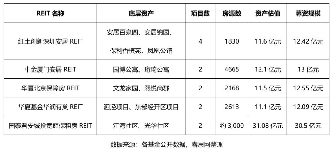 截至目前,红土深圳安居REIT持有的基础设施资产共四个,均位于深圳,分别为安居百泉阁项目、安居锦园项目、保利香槟苑项目和凤凰公馆项目,建筑面积合计为13.47万平方米,共持有1,830套保障性租赁住房、9间商铺以及510个停车位物业产权。