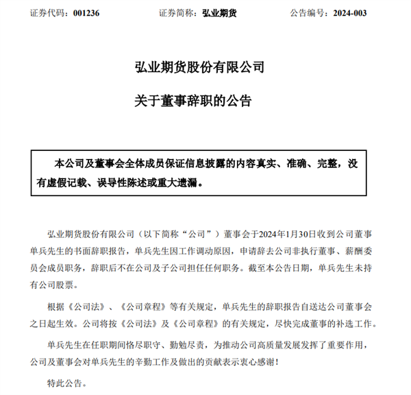 无独有偶,今年1月31日,弘业期货又公告公司董事辞职。公告显示,公司董事单兵先生的书面辞职报告,单兵先生因工作调动原因,申请辞去公司非执行董事、薪酬委 员会成员职务,辞职后不在公司及子公司担任任何职务。截至本公告日期,单兵先生未持有公司股票。