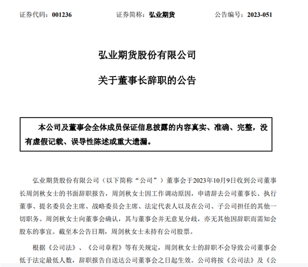 具体来看,2023年10月10日,公司公告公司董事长周剑秋女士提交辞职报告。公告显示,周剑秋女士因工作调动原因,申请辞去公司董事长、执行董事、提名委员会主席、战略委员会主席、法定代表人以及在公司、子公司担任的其他一切职务。