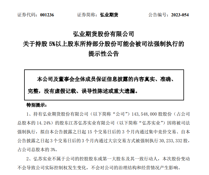 除了人事变动外,去年11月公司曾发布公司股东所持部分股份可能被司法强制执行的公告。弘业期货发布的公告显示,持有弘业期货股份有限公司143548000股股份(占公司总股本14.24%)的股东江苏弘苏实业有限公司因将被司法强制执行,将在公告披露之日起3个交易日后的3个月内通过大宗交易方式被强制执行30233332股,占公司总股份的3%。