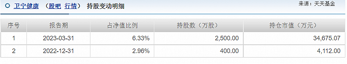 招商基金另一名基金经理陈文凯管理的招商3年封闭运作瑞利灵活配置混合,同样也逆势而上。2022年末持股数量400万股,2023年一季度狂买2100万股,总计持股数量2500万股,位居卫宁健康第十大流通股东。