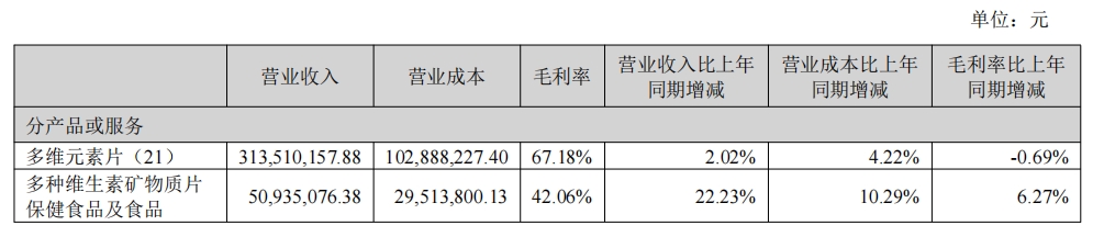 据半年报数据显示,报告期内,多维元素片(21)创造营收3.14亿元,同比增长2.02%,毛利率高达67.18%;多种维生素矿物质片保健食品及食品板块也表现出色,实现营收5093.51万元,同比增长22.23%,增速明显。