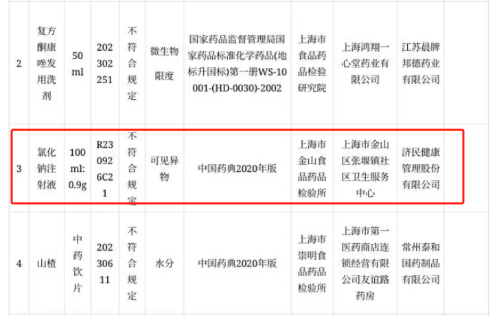 今年8月5日,上海市药监局发布的《关于2024年第1期药品质量抽检通告》显示,共有12个产品被通报不合格,其中就包括济民健康生产的氯化钠注射液,不合格项目为“可见异物”,制剂规格为100ml:0.9g,产品批号为R230926C21。